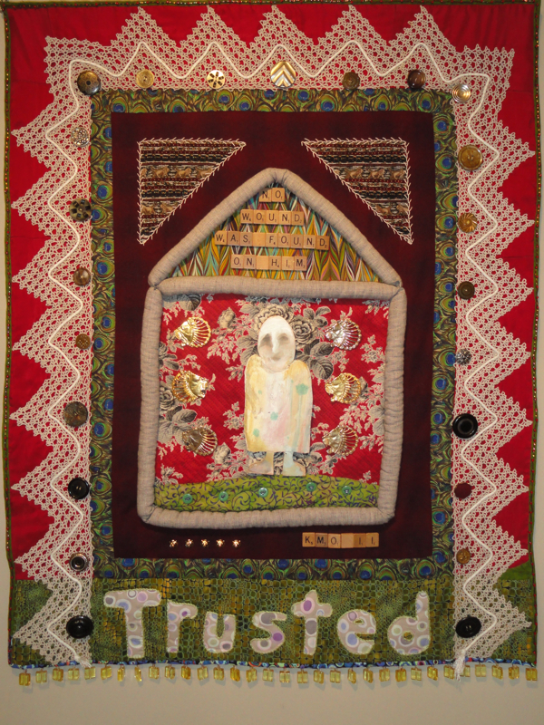 “I pray before each work of art that God would lead me to the many found objects that I include on my quilts. The preliminary sketches are arrived at through prayer.”
