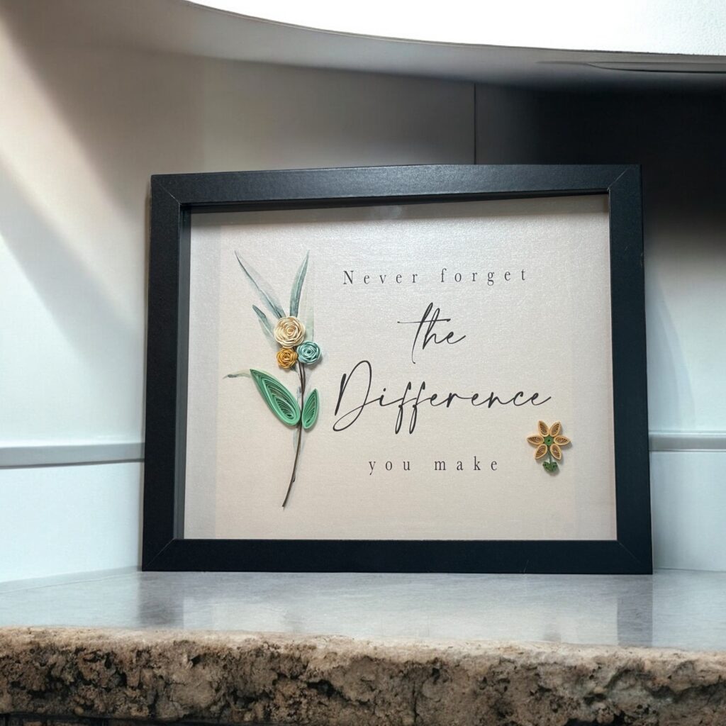 As a quilling artist, Terri rolls, shapes, crimps, and pinches thin strips of paper into detailed coils and forms—florals, leaves, and geometric designs that carry both beauty and intention. Her work reflects patience, care, and a deep sense of presence, qualities that mirror her spiritual life as much as her creative one.